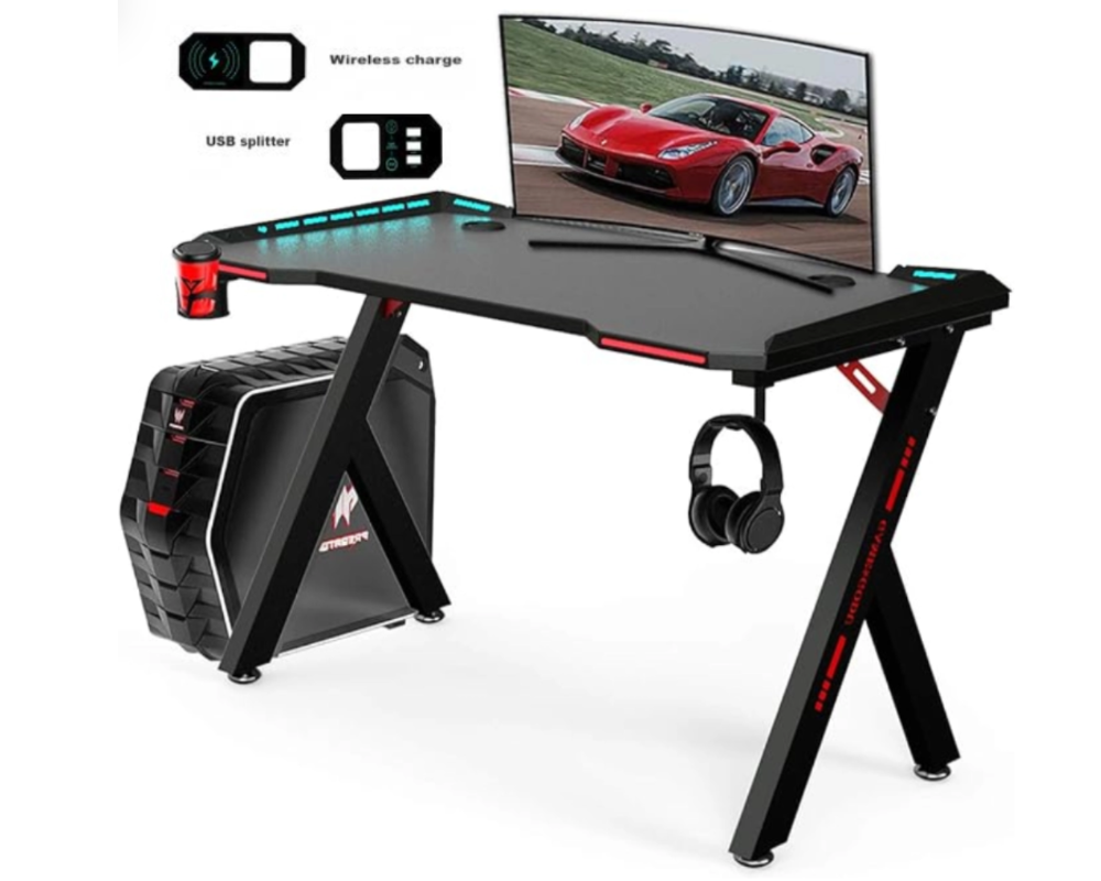 Upgrade your gaming setup with this RGB Gaming Desk, now featuring a wireless charger to keep your devices powered while you play. This modern desk combines vibrant RGB lighting, ergonomic design, and durable construction to deliver an unparalleled gaming experience.