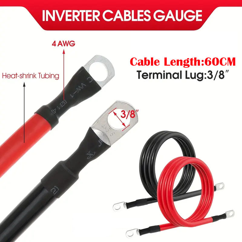 Car Battery Cables 4AWG 60cm Set — Heavy-Duty Battery Cable with 3/8" Terminals, 2pcs Red + Black