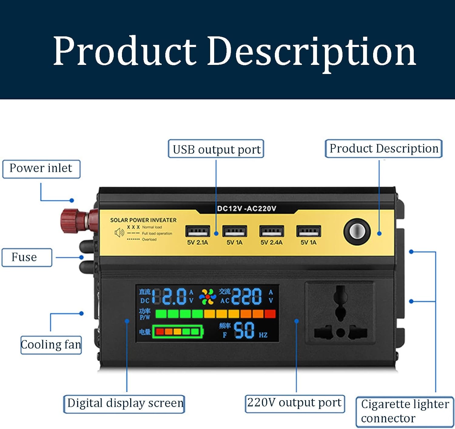 This Solar Power Inverter provides a powerful, portable, and safe energy solution for anyone needing AC power on the go. With intelligent protection, high-efficiency conversion, multiple USB ports, and durable construction, this Solar Power Inverter is ideal for cars, homes, camping, road trips, and solar systems.