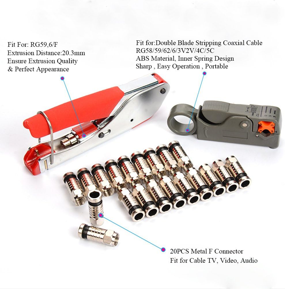 Coaxial Cable Compression Tool Kit — Crimper, Stripper & 20 Connectors | RG6, RG59, RG58 Compatible