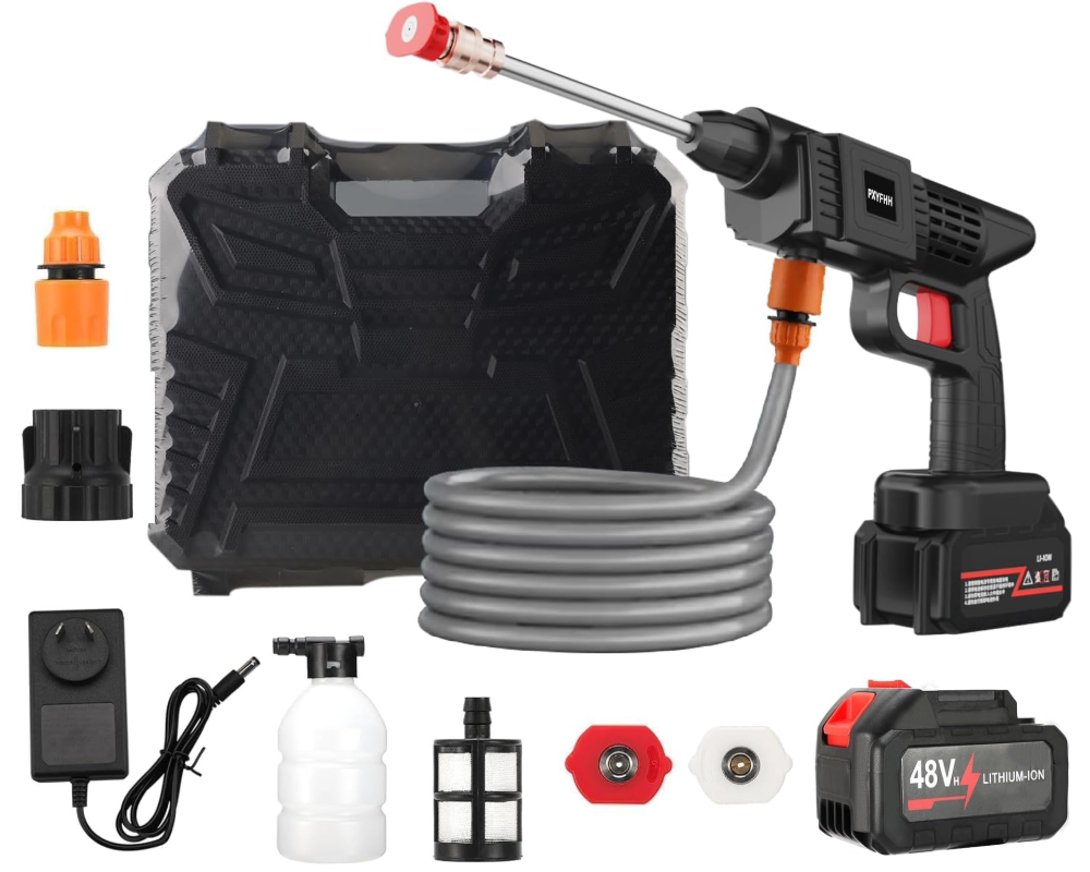 The High Pressure Foam Gun is the ultimate cordless cleaning solution for cars, motorcycles, gardens, patios, and household tasks. With a powerful 300W copper motor, long-lasting rechargeable 15,000mAh battery, and multiple water input options, this High Pressure Foam Gun delivers professional cleaning results wherever you need them. Lightweight, portable, and easy to operate, the High Pressure Foam Gun makes tough cleaning jobs effortless.
