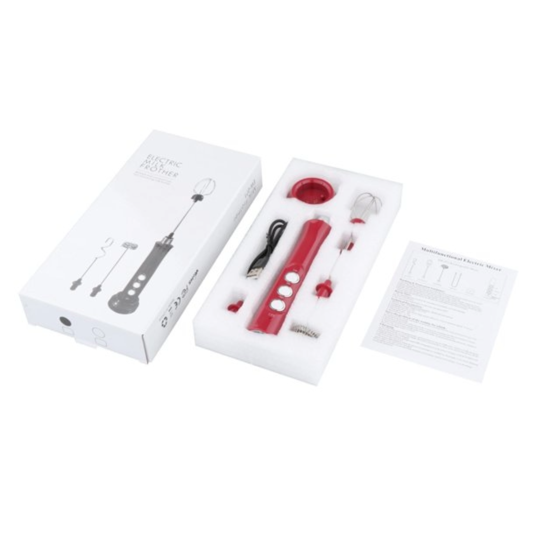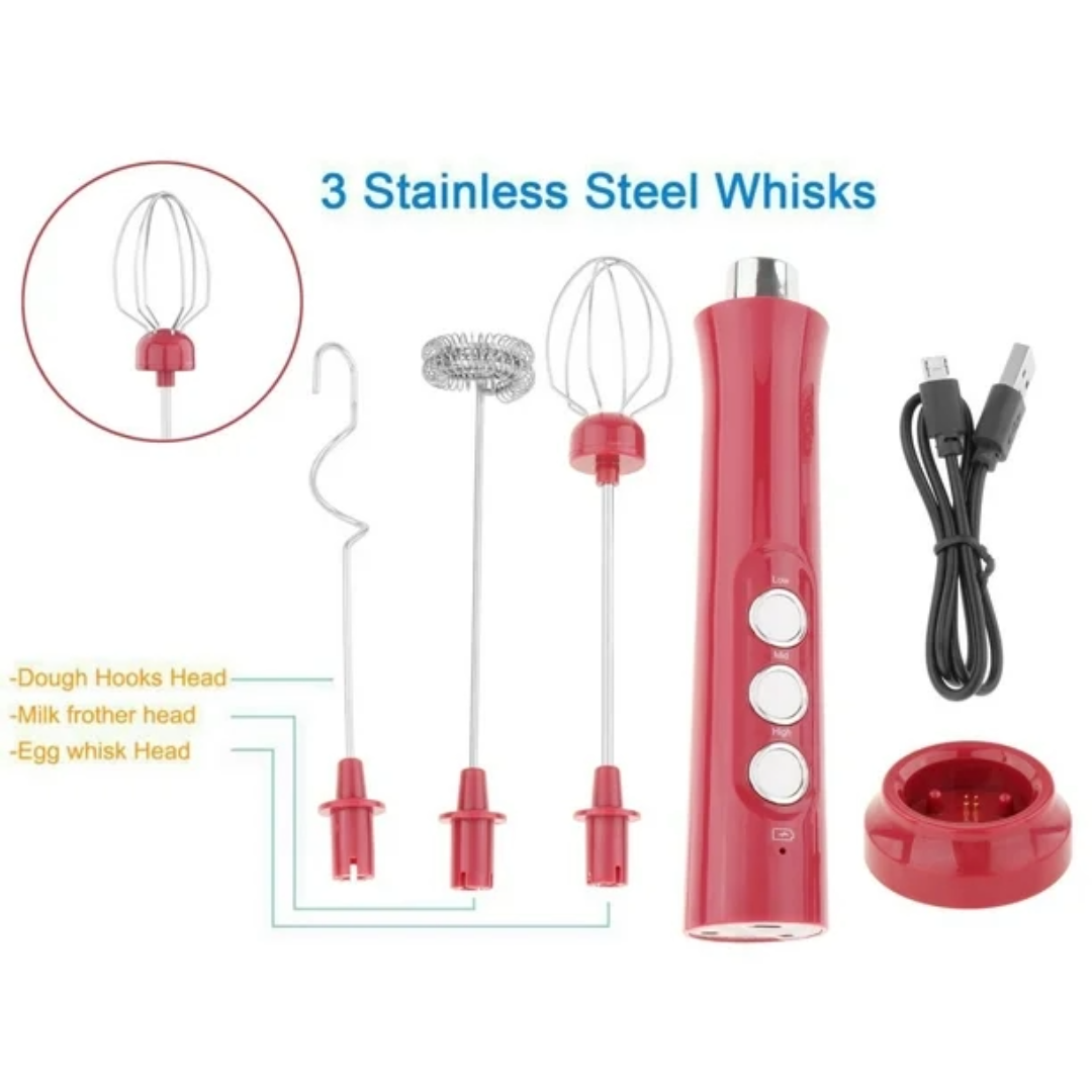 This 3-in-1 Rechargeable Milk Frother is equipped with 3 different whisks, a balloon whisk, a spring whisk, and a hook whisk; make it not only a frother but also an egg beater, a cream maker to meet your different requirements. The built-in lithium 1200mah Rechargeable battery makes it more convenient to use.