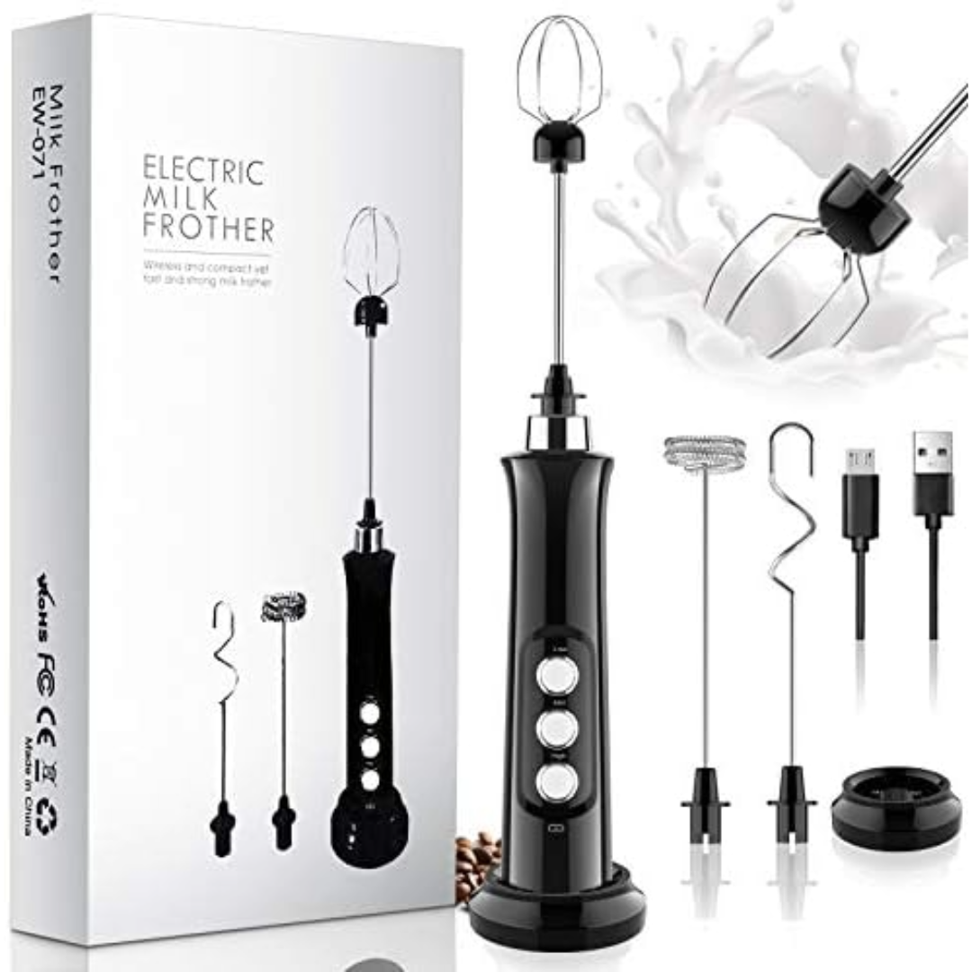 This 3-in-1 Rechargeable Milk Frother is equipped with 3 different whisks, a balloon whisk, a spring whisk, and a hook whisk; make it not only a frother but also an egg beater, a cream maker to meet your different requirements. The built-in lithium 1200mah Rechargeable battery makes it more convenient to use.