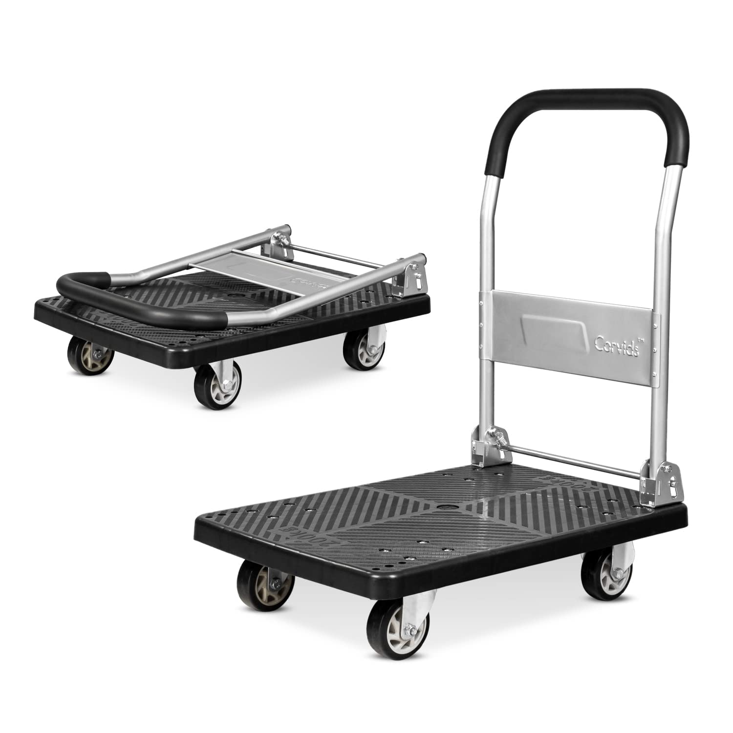 CONVENIENT STORAGE: This platform trolley can be easily and quickly folded and unfolded, The Handlebar folds down to save space and allow for storage in compact areas such as closets or designated areas in the warehouse