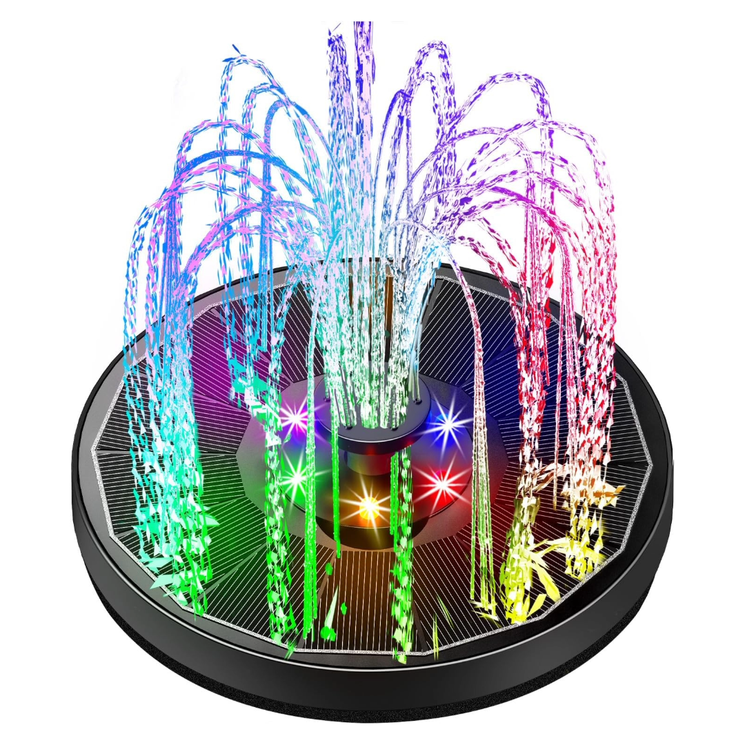 Solar Fountain Pump with Colorful LED Light: Battery Storage Power. 3.7V solar pump floating fountain with 1200mAh battery. In the enough sunlight automatically pumps water. 8 colorful LED lights will light at night. RGB color auto-cycle setting makes your night more beautiful. Need enough energy for LED lighting, the lights will not work if no energy. A full solar charge supports 4 hours lighting.