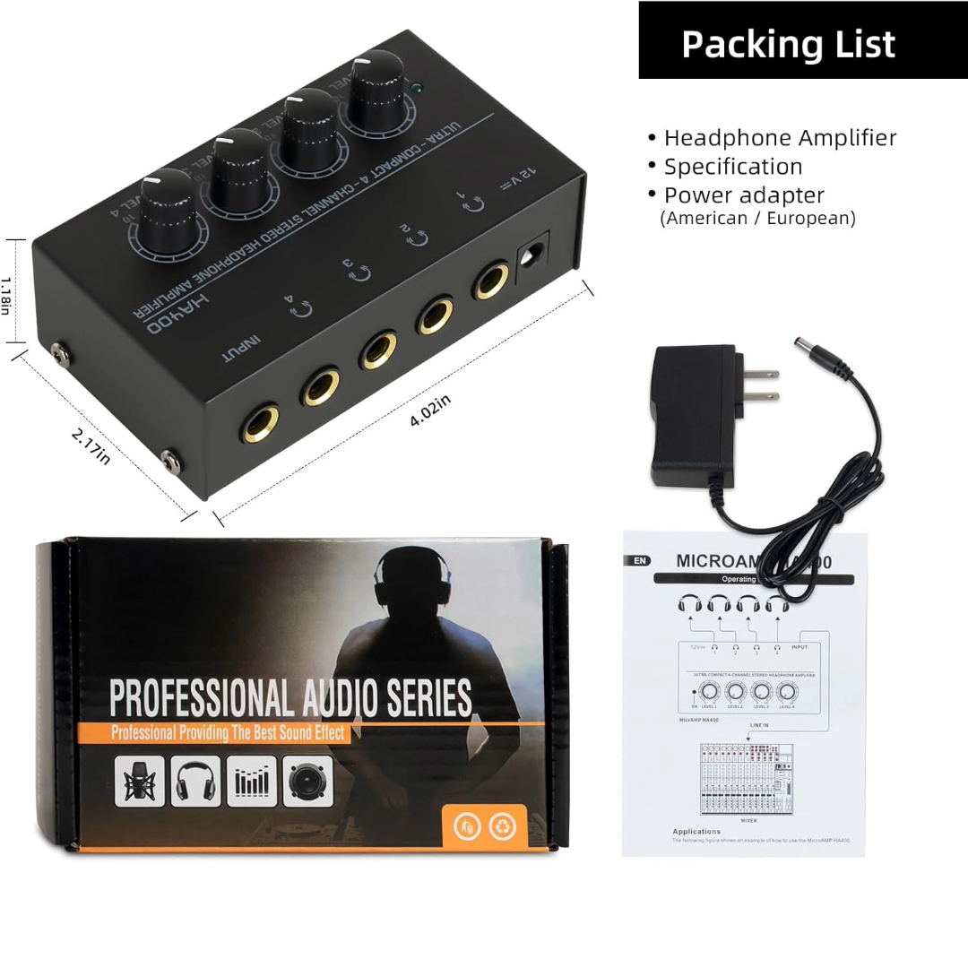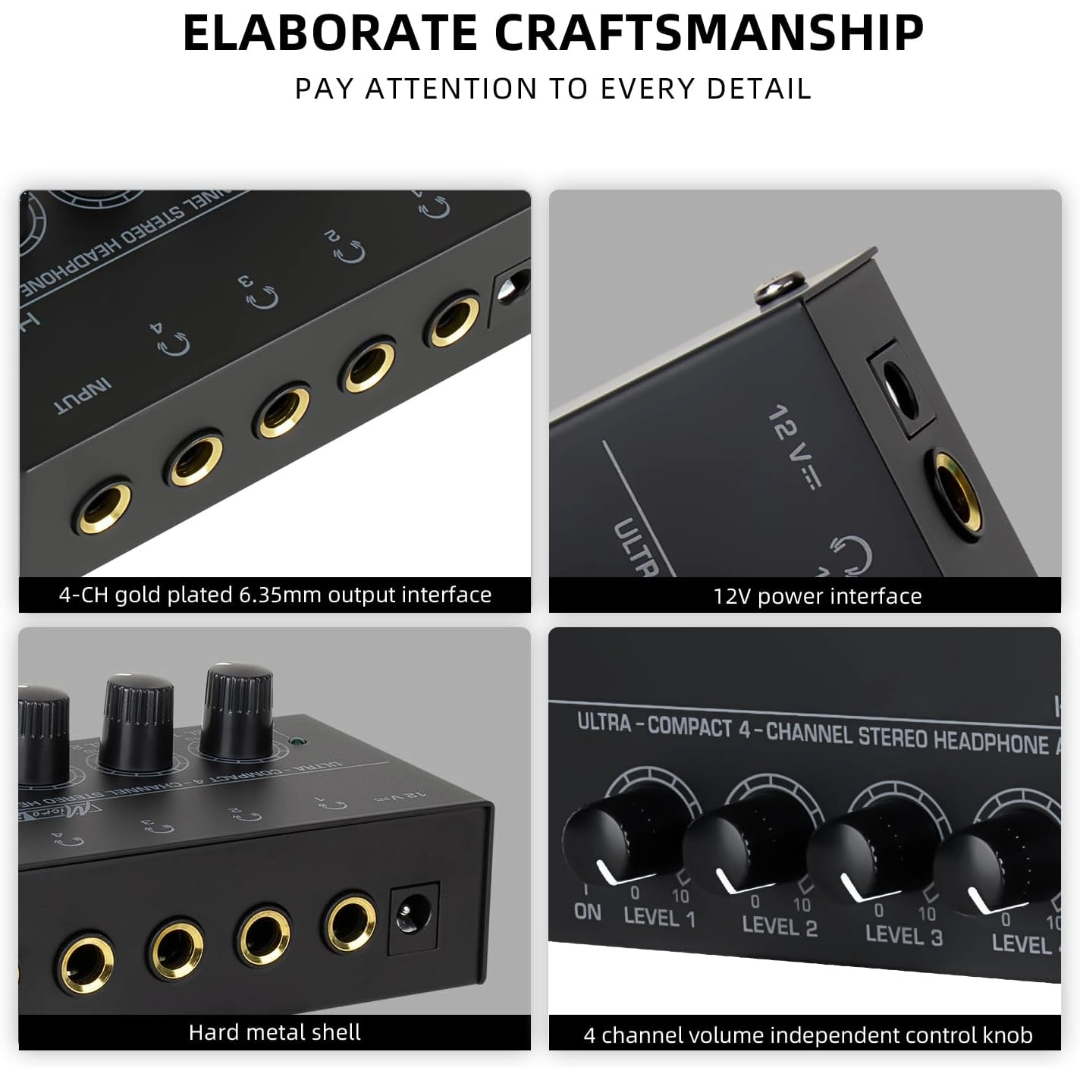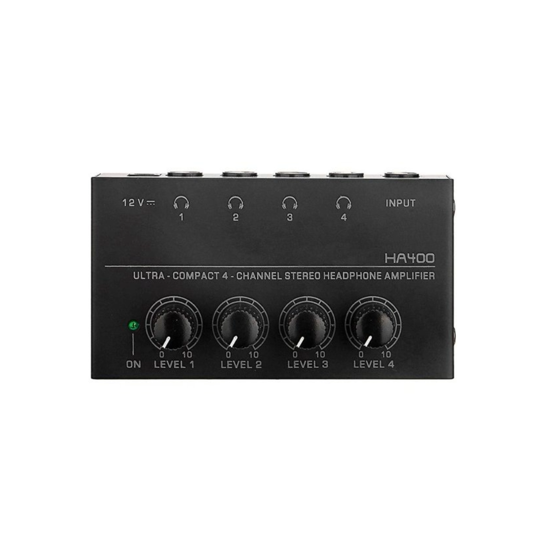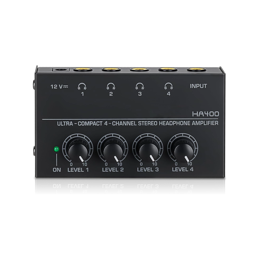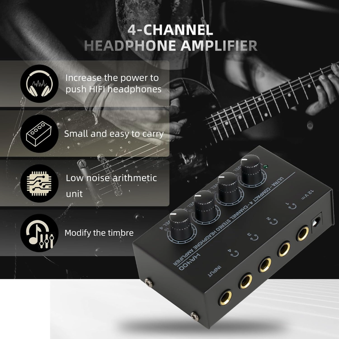 This 4 Channel Headphone Amplifier has a power indicator, with a 6.35mm (1/4 inch) TS connector, and provides a DC 12V power adapter. The headphone has a compact structure and flexible adjustment, which is very suitable for studios and stages.
