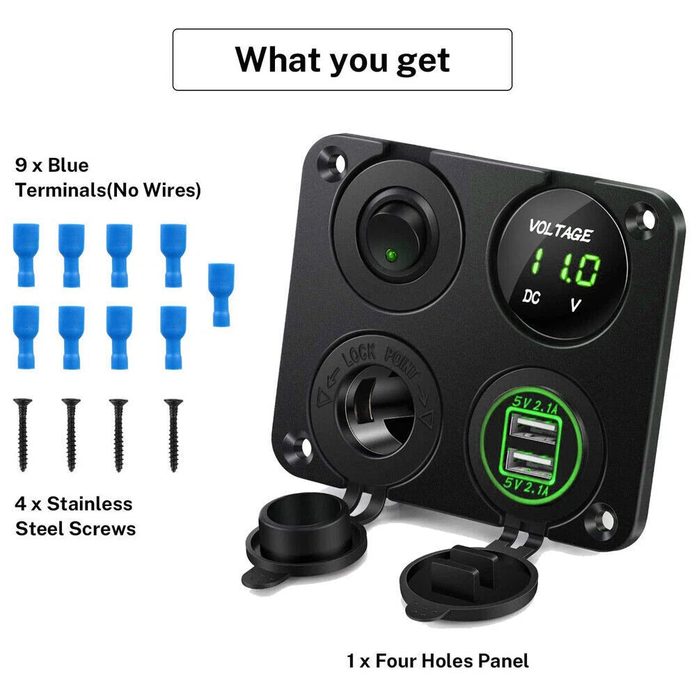 Charger Socket Panel with Dual USB Ports, LED Voltmeter & Cigar Lighter Socket — For Car, Boat, RV & Truck (Green Light)