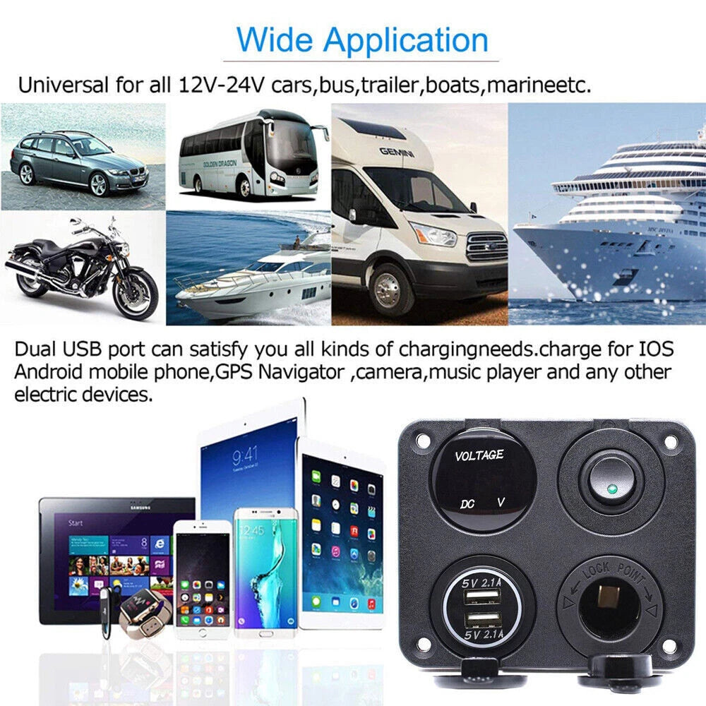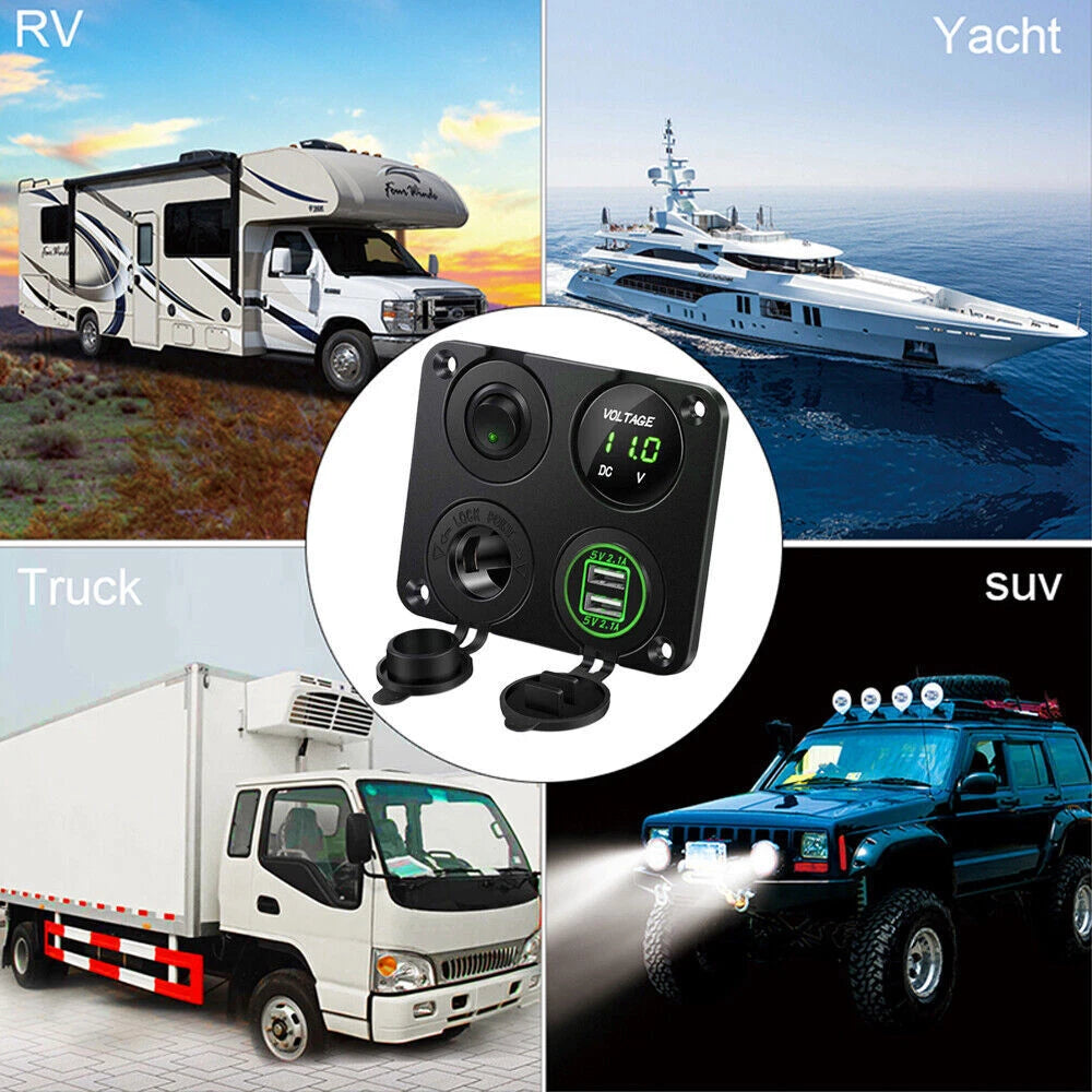 Keep your devices charged and your battery monitored on the go with this multi-functional Charger Socket Panel. Designed for cars, trucks, RVs, boats, and off-road vehicles, it features dual USB ports, a digital voltmeter, an LED toggle switch, and an extra cigar lighter socket for added convenience.