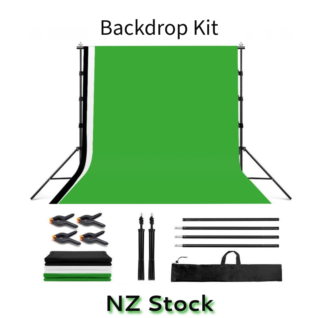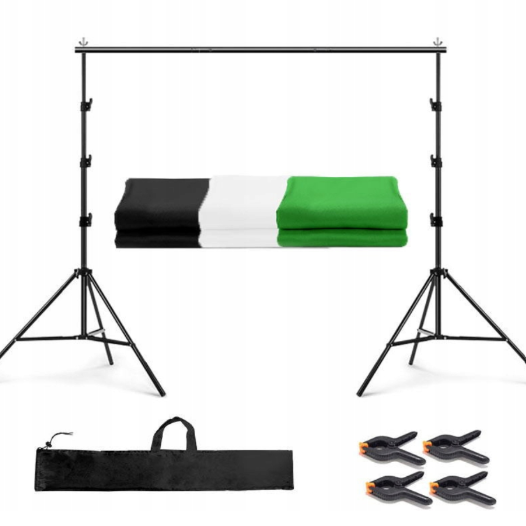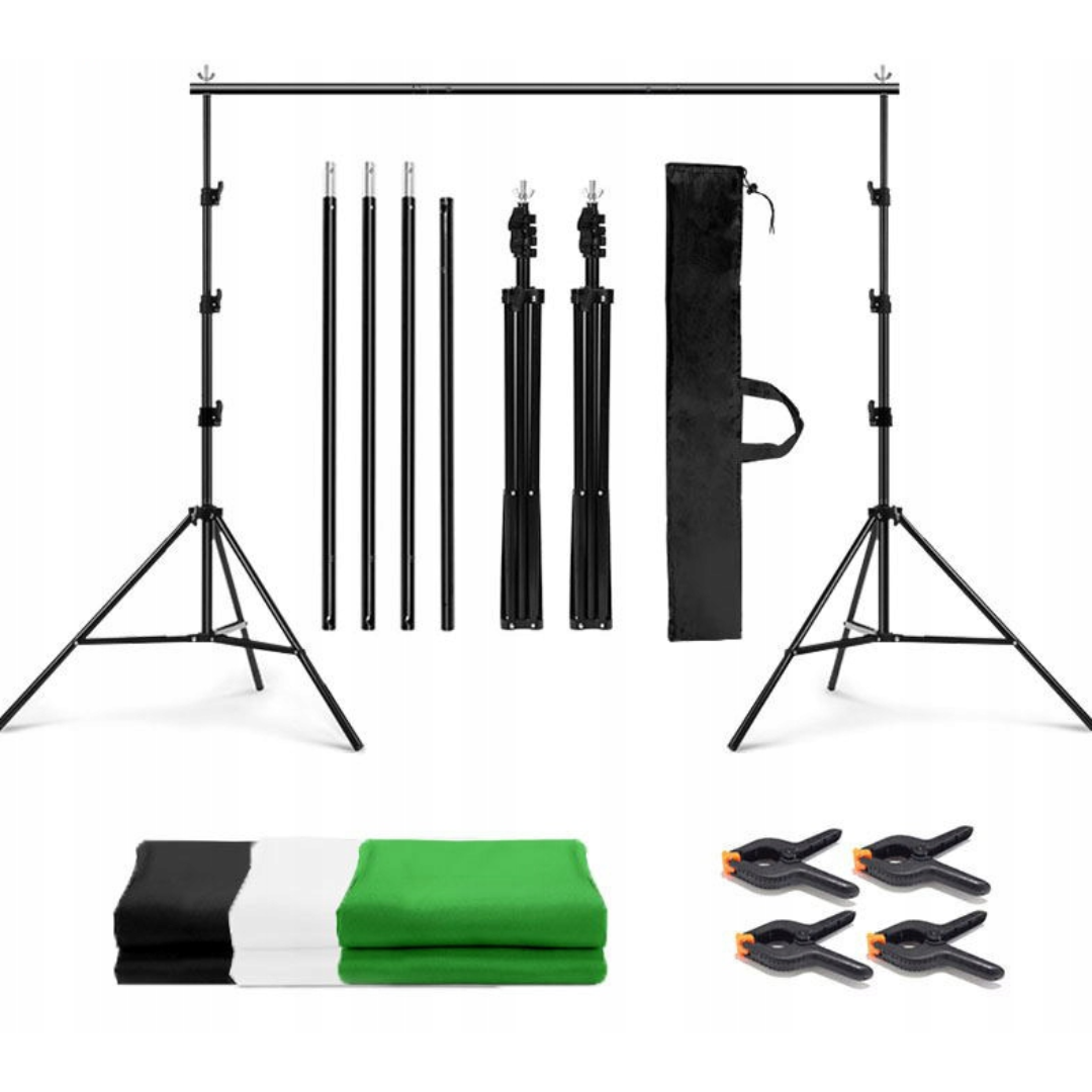 The set includes: Two stands, a crossbar, a carrying bag, mounting clips, Backgrounds (green, black, white)