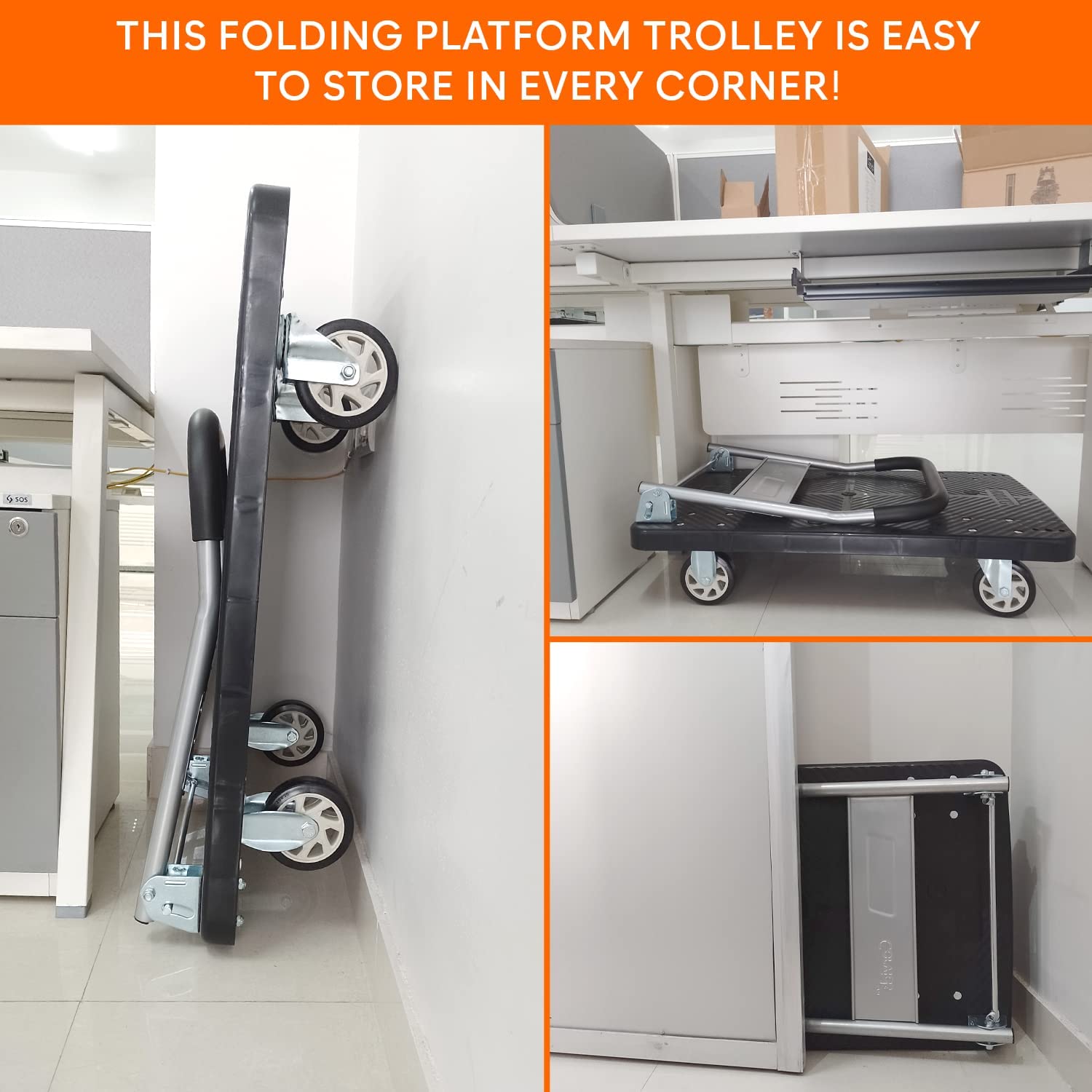 This Folding Platform Trolley is a reliable solution for transporting heavy and bulky items with ease. With a foldable design, strong anti-slip platform, silent swivel wheels, and durable construction, this Folding Platform Trolley is suitable for home, office, warehouse, and workshop environments.