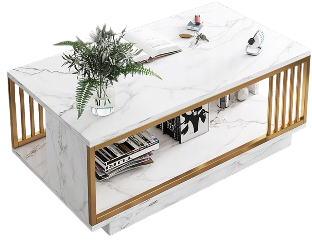 Minimalist White Coffee Table with Marble Finish – Modern Two-Tier Storage & Stainless Steel Frame